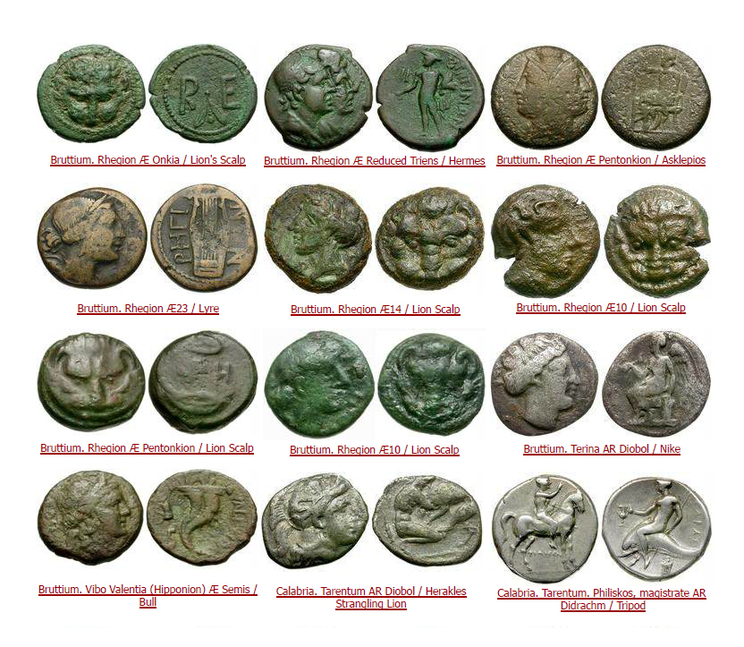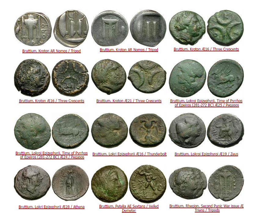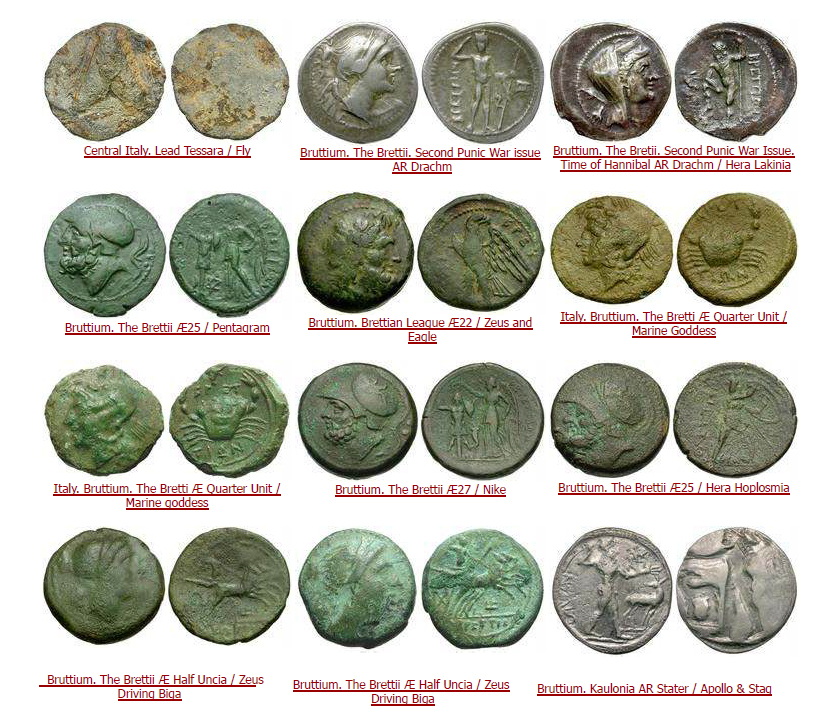 La monetazione dei Brettii si data agli anni fra 215 e 203 a.C. quando questi erano alleati di Annibale. Era organizzata secondo diverse serie di emissioni, nei tre metalli, oro, argento e bronzo, e tagliata sui sistemi ponderali allora in uso in Italia meridionale e Sicilia. Le serie sono probabilmente state emesse nelle zecche di Consentia, Medma e Hippònion, e forse a Terina, Thoùrioi, Crotone e Petèlia.